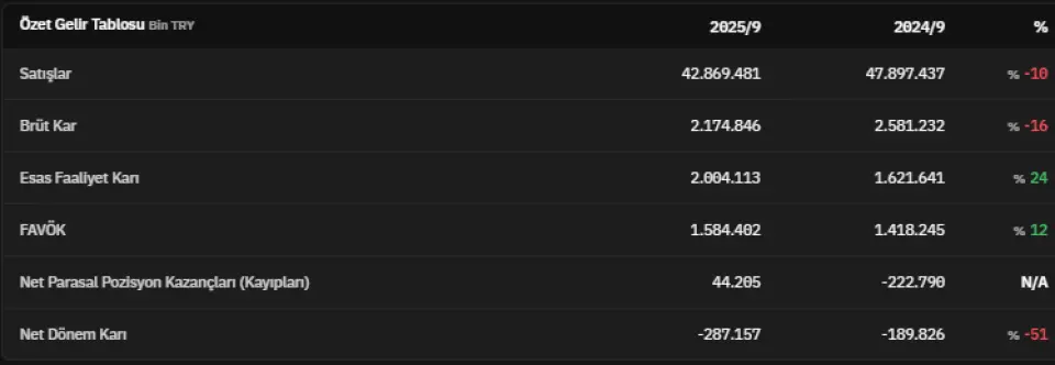 Satışlar 2025 yılının 3. çeyreğinde 42.869.481.000 TL olarak açıklandı. 2025 yılının üçüncü çeyreğinde brüt kar 2.174.846.000 TL olarak açıklandı. 2024 yılının üçüncü çeyreğinde ise bu veri 2.581.232.000 TL olarak açıklanmıştı. Esas faaliyet karını 2.004.113.000 TL olarak açıklayan ULUUN, 2024 yılının üçüncü çeyreğinde esas faaliyet karını 1.621.641.000 TL olarak açıklamıştı.FAVÖK 2025 yılının üçüncü çeyreğinde 1.584.402.000 TL olarak açıklandı. Net parasal pozisyon kazançları 2025 yılının üçüncü çeyreğinde 44.205.000 TL olarak kaydedildi. Net dönem kârı ise -287.157.000 TL olarak kaydedildi.