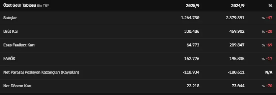 FAVÖK 2025 yılının üçüncü çeyreğinde 162.776.000 TL olarak açıklandı. Net parasal pozisyon kazançları 2025 yılının üçüncü çeyreğinde -118.934.000 TL olarak kaydedildi. Net dönem kârı ise 22.218.000 TL olarak kaydedildi. İlgili veri 2024 yılının üçüncü çeyreğinde 73.044.000 TL olarak açıklanmıştı.