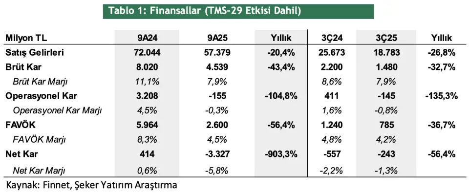 Şirket’in TMS-29 etkisi dâhil net satış gelirleri 3Ç25’te geçen yılın aynı dönemine göre %26,8 düşüşle bizim 21.600mn TL beklentimizin ve piyasanın 20.125mn TL medyan beklentisinin altında kalarak 18.783mn TL oldu. 3Ç25’te hem iç pazarda hem de ihracat pazarlarında fiyatlama ortamı zayıfladı ve gelirlerde düşüş yaşandı.