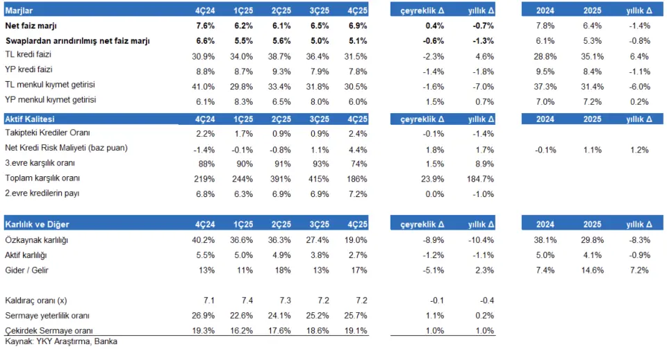- " Bankanın özkaynak karlılığı hedefi %25 (YKYt: %24). Banka 2026’da swap dahil net faiz marjında yaklaşık 100 baz puan düşüş, düşük %10’lu kur etkisi hariç kredi büyümesi ($ bazında), 50 baz puan kur hariç risk maliyeti, >%50 komisyon geliri artışı ve ortalama enflasyonun üzerinde faaliyet gideri büyümesi öngörmektedir. Bankanın hedeflerini makul olarak değerlendiriyoruz."