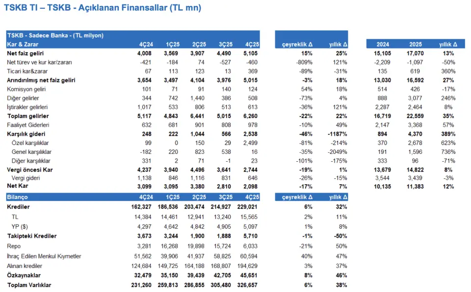 - "TSKB’nin 4Ç25 net karı piyasa beklentisinin %4 üzerinde gerçekleşti. Sonuçları ve 2026 hedeflerini hisse için nötr olarakdeğerlendiriyoruz. Banka için 2026 özkaynak karlılığı beklentimiz %24."