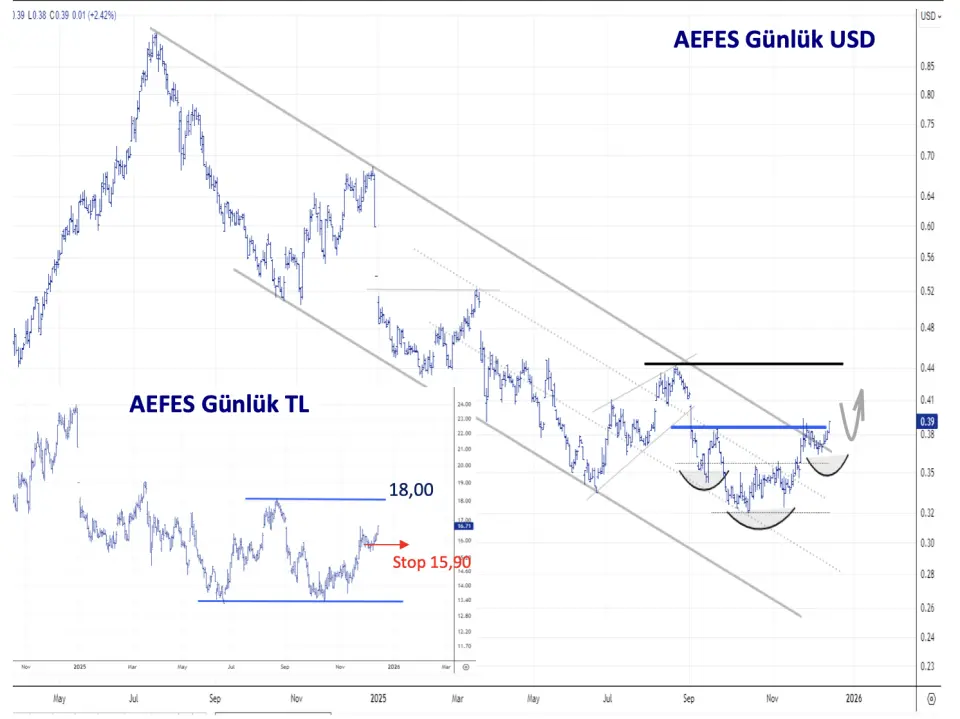 - "Özellikle USD bazındaki günlük grafikte "ters omuz baş omuz" formunda yükseliş yönünde bir trend değişim formu yaşanmakta olabileceğini düşündüğümüz hisseyi 15,90 TL stop olmak üzere ALIM yönünde izlemeyi tavsiye ediyoruz."
