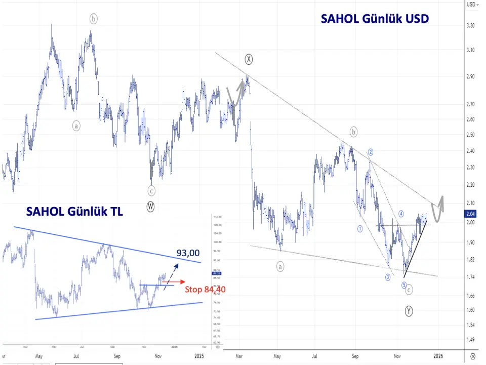 - "Özellikle USD bazlı günlük grafikteki teknik yapısı itibarıyla, kompleks bir düzeltme sürecinin sonlanmış olabileceğini düşündüğümüz SAHOL hissesini 84,40 TL stop olmak üzere ALIM yönünde izlemeyi tavsiye ediyoruz."
