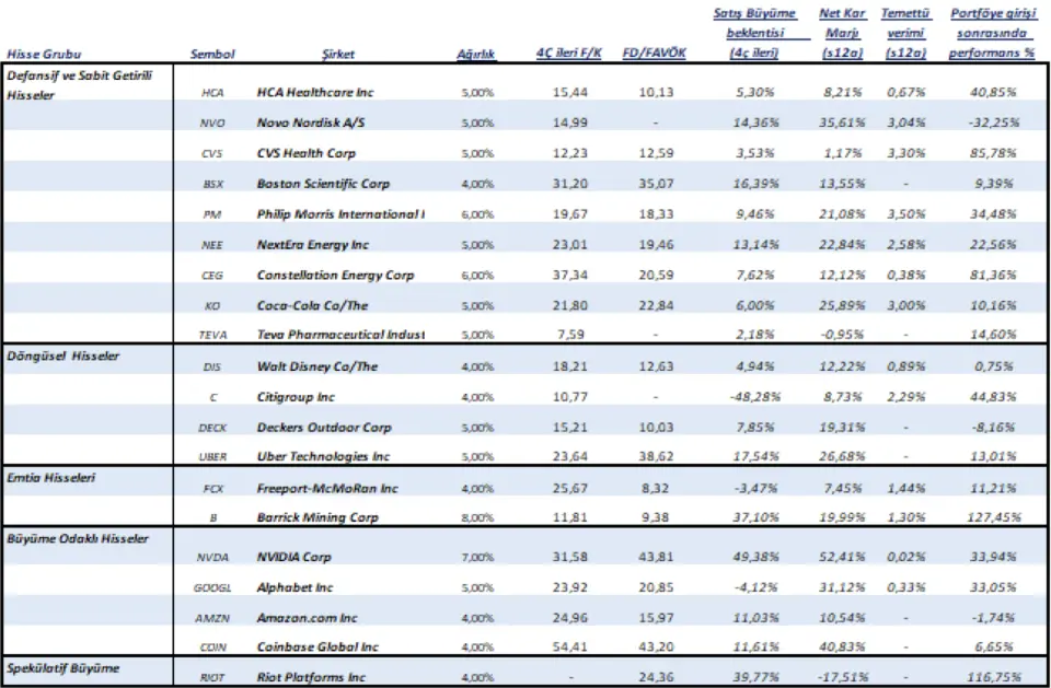 Portföyde en güçlü performans gösteren üç hisse Barrick Mining (+%127), Riot Platforms (+%117), ve CVS Health Corp (+%86) olurken, en zayıf performansı Deckers (-%8) ve Novo Nordisk (-%32) gösterdi.