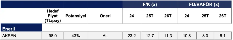 - "Devam eden kapasite artışları spot fiyatları baskı altında tutarken, hava koşulları fiyatlama açısından temel belirleyici olmaya devam ediyor. Güçlü hidro üretimi aşağı yönlü riskleri artırırken, yağışların zayıf seyretmesi doğalgaz santrallerini destekleyebilir. Aksa Enerji <AKSEN TI> gibi PPA bazlı oyuncuların daha dayanıklı kalması beklenirken, serbest piyasa üreticilerinin marj baskısıyla karşı karşıya kalmaya devam etmesi olası. Bu gerekçelerle garanti döviz bazlı kontratlı gelir yapısı ve 2026 yılında devreye alınacak olan 11 santralin desteğinde operasyonel karlılıktaki iyileşmenin hızlacağına yönelik beklentilerimiz doğrultusunda Aksa Enerji <AKSEN TI> beğenmeye devam ediyoruz."