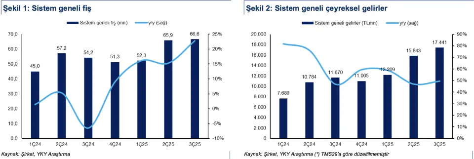 - "Güçlü fiş büyümesi. Sistem genelindeki fiş sayısı, 3Ç25’te yıllık %23 artışla 66,6 milyona ulaştı. Bu artışta, i) rekabetçi menü satışları (örneğin, ikili menü), ii) yeni ürün lansmanları ve iii) sektör genelindeki düşüş eğilimine rağmen üst segment menülerin olumlu katkısı etkili oldu. Sistem genelindeki toplam restoran sayısı 1.975'e ulaştı (yıllık +%11; TAB restoranı: 1.097, franchise: 878). Ayrıca, ~2,4 bin kiosk sayesinde dijital satışların toplam satışlardaki payı %48'e (2024'teki %36'ya kıyasla) ulaşırken, paket servis satışlarının payı %28'e (2024'teki %24'e kıyasla) ulaştı."