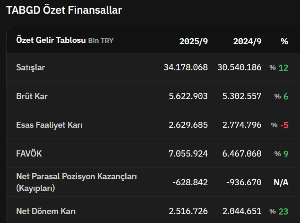 TABGD, 2025 yılının 3. çeyreğine dair açıkladığı bilançoya göre konsolide hasılatını yıllık bazda artırarak %11,9 artarak 34,18 milyar TL'ye ulaşmıştır. Bu büyüme, operasyonel karlılığa aynı oranda yansımamış; Düzeltilmiş FAVÖK %8,9 artışla 7,12 milyar TL'de kalırken Düzeltilmiş FAVÖK marjı 0,6 puanlık bir gerilemeyle %20,8'e düşmüştür. Çeyreklik hasılat %15,1 artarken net kar %31,2 artışla 944 milyon TL'ye ulaşmıştır. Marjlardaki daralmaya karşın, 3. çeyrek karı yıllık bazda %23,1'lik artışla 2,52 milyar TL olarak gerçekleşmiştir. Net kardaki artışın alt kalemlerine bakıldığında ise azalan parasal kayıp etkisi ve bilançodaki yüksek nakit pozisyonundan elde edilen finansal gelirlerdeki %97'lik artışın net karı desteklediği görülmüştür.