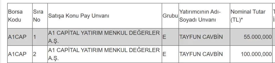 Bu işleme konu olan bir şirket oldu. Bu şirket, A1 CAPİTAL YATIRIM MENKUL DEĞERLER A.Ş. olurken, çeşitli yatırımcılar E tipi işlem görmeyen paylarının bir miktarını borsada işlem gören tipe dönüştürmek için başvuru yaptı.