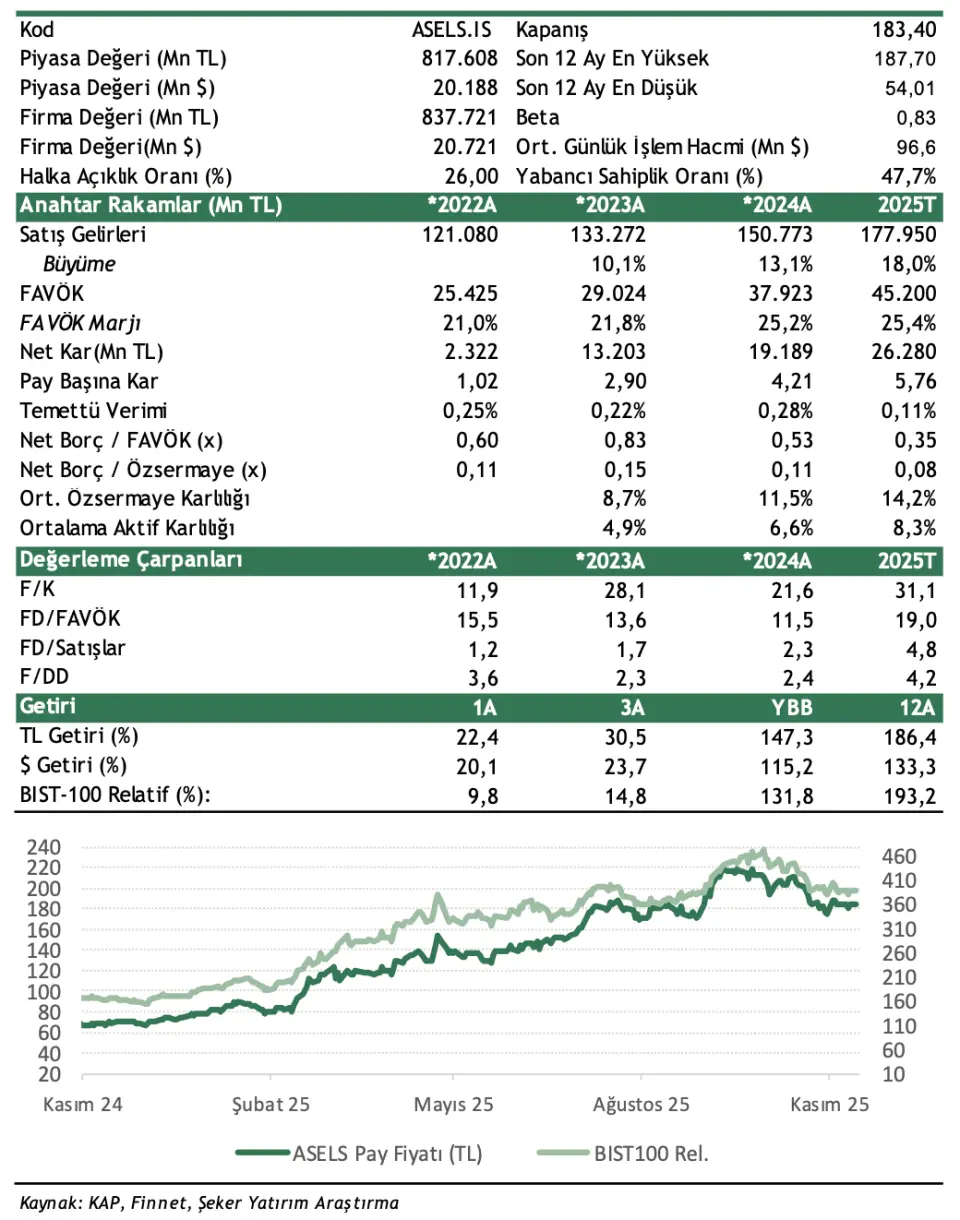 - "ASELSAN, 2025 yılı 3. çeyrekte 3.075mn TL piyasanın medyan beklentisini ve bizim 3.250mn TL beklentimizi aşarak TMS-29 etkisi dahil 4.765mn TL ana ortaklık karı elde etti (3Ç24: 2.671mn TL). 3Ç25’te net satış gelirlerindeki artış ile birlikte başarılı operasyonel maliyet yönetimi sonucu elde edilen esas faaliyet karındaki artış, net finansman gideri ve parasal pozisyon kaybındaki azalış net kar rakamını destekledi."