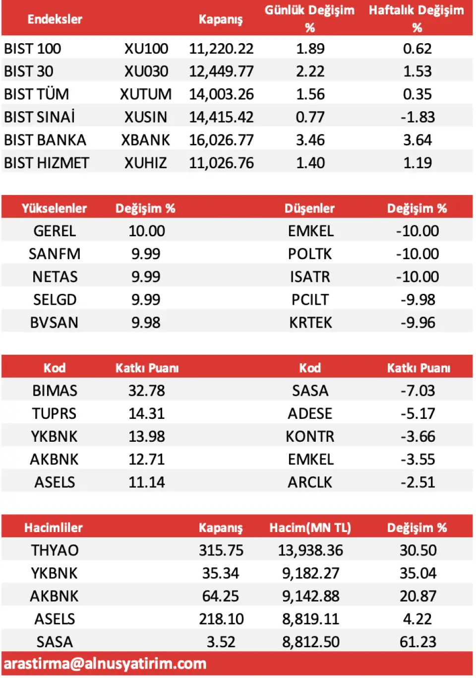 - "Dünkü işlem gününe; BİST-100 endeksi, 19,31 puanlık düşüşle başladı. Gün içerisinde 10.896,41 puan seviyesine kadar gerileyen Ulusal-100 endeksi, öğleden sonra başlayan alım ağırlıklı işlemler ile artıya geçti. İlerleyen saatlerde Bankacılık Endeksi şirketleri önderliğinde yukarı yönlü hareketler ivme kazanırken; günün sonunu yüzde 1,89 oranındaki güçlü yükselişle, 11.220,22 puandan noktaladık. Endeksin işlem hacmi de; önceki güne göre 29,4 Milyar TL civarındaki hızlı artışla 162,6 Milyar TL civarında gerçekleşti. BİST 100 endeksine puan bazında en fazla pozitif etki eden şirket hisseleri ise; 32,78 puan ile BIMAS, 14,31 puan ile TUPRS ve 13,98 puan ile YKBNK olarak karşımıza çıktı."