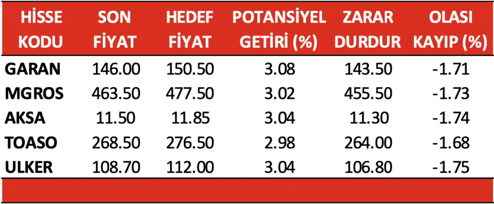 Borsa İstanbul'un yatırımcılarına GARAN, MGROS, AKSA, TOASO ve ULKER hisseleri öneriliyor. BİST 100 endeksi değerlendirmesi yapan aracı kurum, piyasaları özetledi.