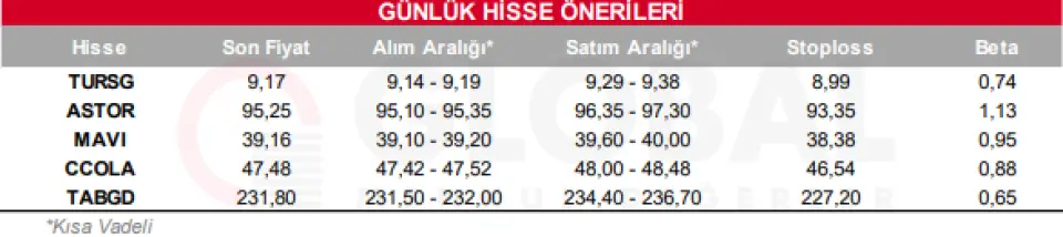 Global Menkul Değerler, yayımladığı günlük bültende iç ve dış piyasaları mercek altına alırken, güncel veriler doğrultusunda gün içi hareket potansiyeli yüksek hisseleri yatırımcıların dikkatine sundu. Küresel risk iştahındaki dalgalanmaların etkili olduğu ortamda, Borsa İstanbul’da seçili hisselerde öne çıkabilecek hareketler bekleniyor.