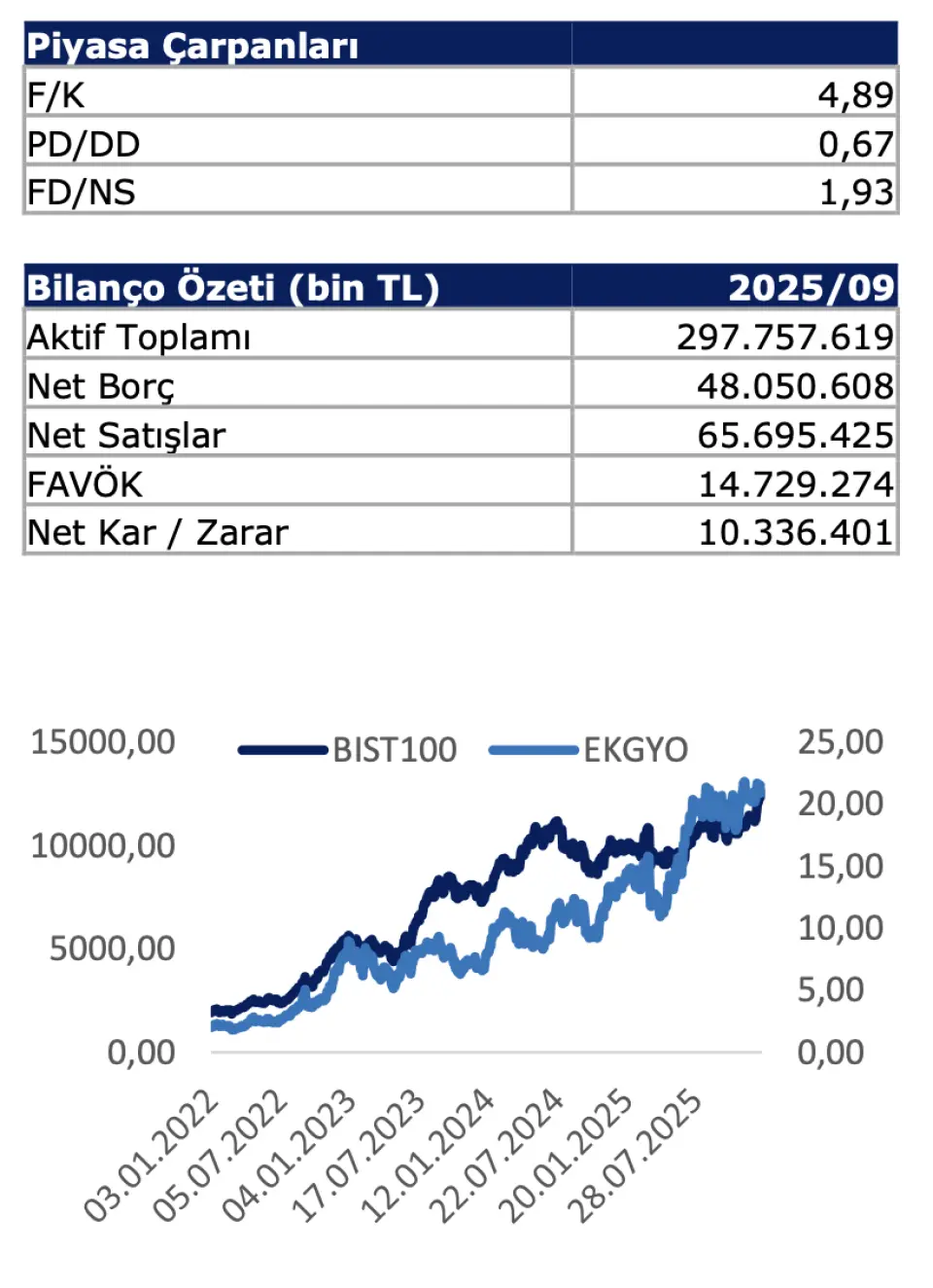 EKGYO'nun son bir senelik süreçte BIST100 endeksinin %24,90 üzerinde performans sergilediği belirtildi. Şirketin son verilere göre 4,89 F/K ve 0,67 PD/DD ile işlem gördüğü aktarıldı.Anadolu Yatırım, EKGYO hissesi için hedef fiyatı 17,9 TL’den, 36,5 TL’ye güncelledi. EKGYO hisse önerisi ise ‘AL’ olarak açıklandı. EKGYO hissesinin prim potansiyeli de %59,25 oldu.