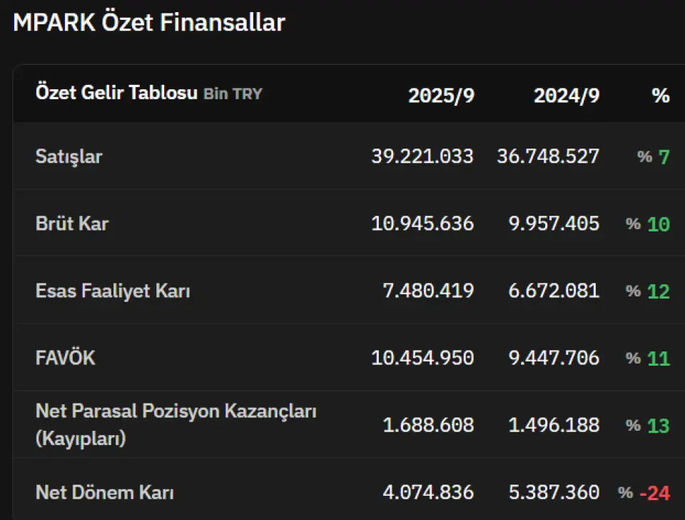 MPARK 3. çeyrek bilançosunu açıkladı. Şirket geçen yl 3. çeyrekte 5.387.360.000 TL kar açıklamışken bu yıl 3. çeyrekte karlılıkta %24 düşüş gözlendi ve şirket 4.074.836.000 TL kar etti.