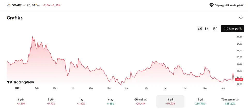 Smartiks, güne yükselişle başlayan şirketler arasında yer aldı. Gün içindeki bu pozitif başlangıca rağmen, hissede son dönemde yaşanan dalgalı hareketler yatırımcıların dikkatini çekmeye devam ediyor. Ancak genel tabloya bakıldığında görünüm çok da parlak sayılmıyor. Son 1 yıllık performans incelendiğinde Smartiks hissesi, yatırımcısına yaklaşık %20 oranında değer kaybı yaşattı. Bu durum, özellikle uzun vadeli yatırımcılar açısından moral bozucu bir tablo ortaya koyuyor.