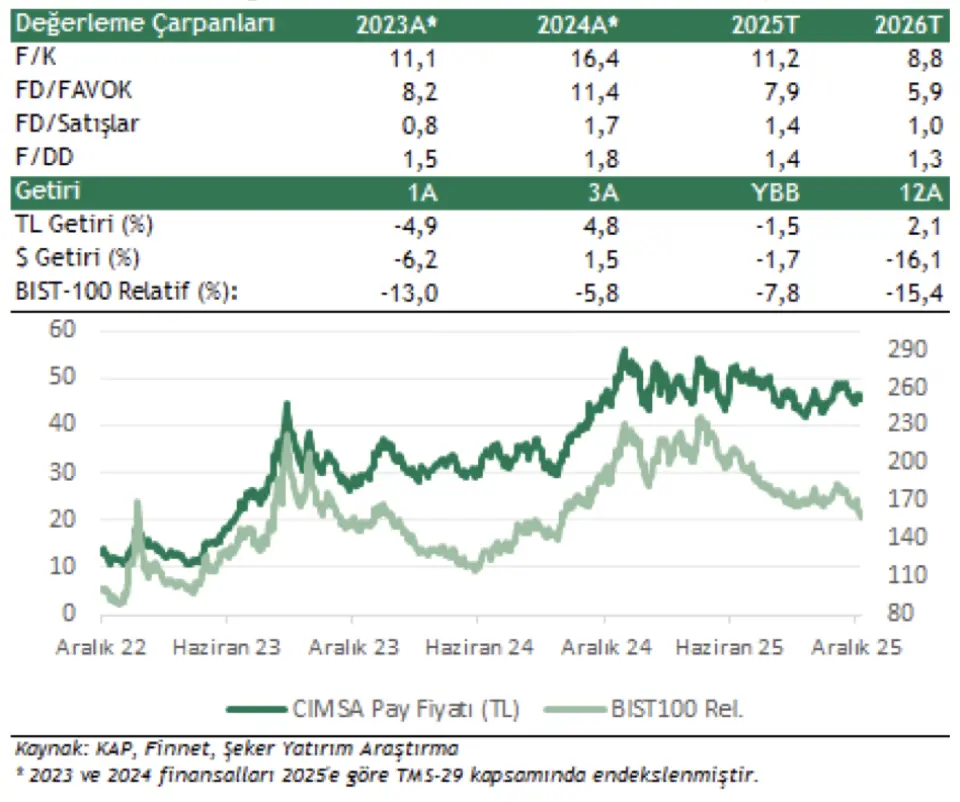 - "2026 yılında, Şirket’in yüksek kapasite kullanım oranını sürdürmesini, yurt içi çimento satış hacminin 2025 yılı seviyelerinde kalmasını ve yurt dışı satış hacminin ABD’de devreye alınan gri öğütme tesisinin inorganik katkısıyla artmasını beklemekteyiz. Ayrıca, 2026 yılının ilk yarısında devreye alınması planlanan Mersin Fabrikası CAC tesisi kapasite artırım yatırımı ile, Şirket’in küresel lider konumda olduğu CAC üretim kapasitesinin %50 artarak 197 bin tona ulaşacağını öngörmekteyiz. Bu yatırımın, ihracat pazarlarında büyümeyi ve katma değerli ürün portföyünün genişletilmesini desteklemesinin yanı sıra, orta vadede Şirket’in operasyonel performansını daha güçlü bir seviyeye taşıyacağını düşünmekteyiz. Çimsa’nın 2025 yılında 46.598mn TL satış geliri, 8.131mn TL FAVÖK ve 3.918mn TL net kar elde etmesini bekliyoruz. 2026 yılı içinse 62.115mn TL satış geliri, 10.887mn TL FAVÖK ve 4.928mn TL net kar beklentimiz bulunuyor."