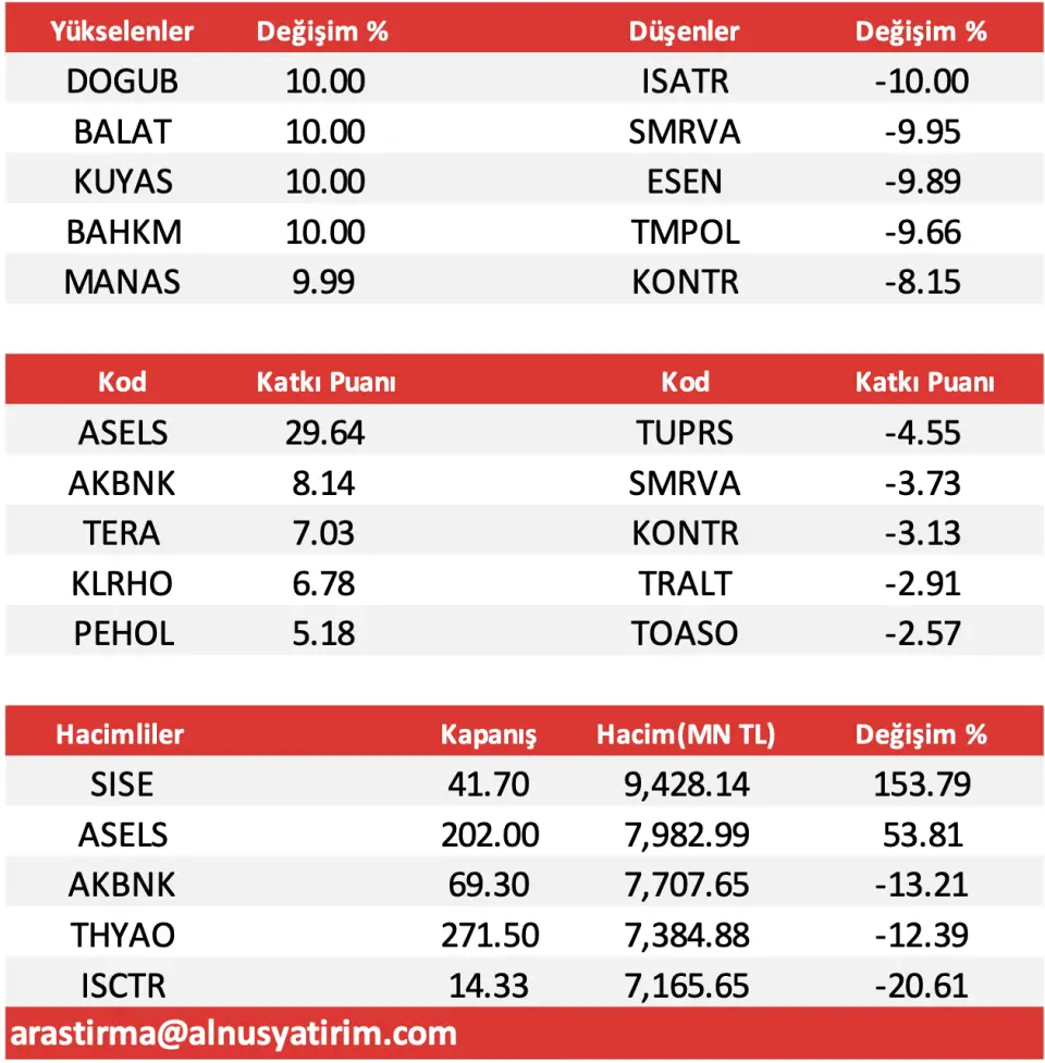 - "Dünkü işlem gününe BİST-100 endeksi; 20,81 puanlık yükselişle başladı. Gün içerisinde dalgalı seyir izleyen endekste, kapanışa doğru alım ağırlıklı işlemlerin bir miktar etkili olmasıyla; seansın sonunu yüzde 0,44 oranındaki yükselişle, 11.238,36 puandan noktaladık. Endeksin işlem hacmi ise; önceki günkü 148,3 Milyar TL düzeyinden 130,8 Milyar TL’ye geriledi. Endekse puan bazında en fazla pozitif etki eden şirket hisseleri; 29,64 puan ile ASELS, 8,14 puan ile AKBNK ve 4,99 puan ile KUYAS oldu."