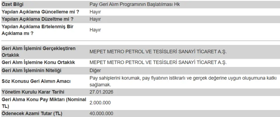 Bu olumlu tabloya rağmen şirket pay geri alım programı kararı aldı. MEPET önümüzdeki 1 yıl içinde 2 milyon lot hissesini borsadan geri alacak. Bu alım işlemi için 40 milyon TL bütçe ayrıldı.