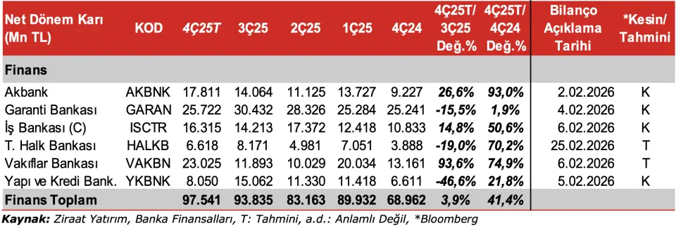 - "Tüm bu gelişmelere bağlı olarak, 2025 yılının 4. çeyreğinde takibimizdeki bankaların toplam karlarının bir önceki çeyreğe göre %3,9’luk artarak 97,5 milyar TL’ye çıkmasını öngörüyoruz. Söz konusu kar rakamı, bir önceki yılın aynı dönemine göre ise %41,4’lük artışa işaret etmektedir."