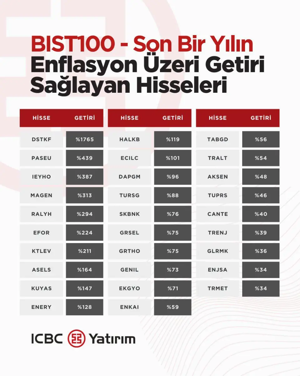 Borsa İstanbul'un aracı kurumu ICBC Yatırım, BİST 100 endeksinde son 1 yılın enflasyon üzeri getiri sağlayan hisselerini açıkladı. ICBC Yatırım, 29 hisseyi yatırımcıları ile paylaştı. Bu hisselerin işlem kodları ve getirileri de sunuldu. En düşük oran ise %34 olarak karşımıza çıktı.