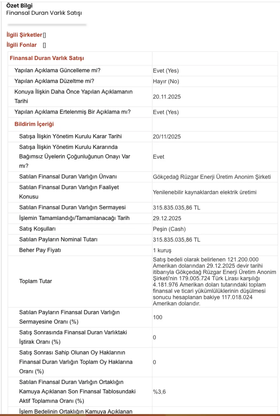 "20.11.2025 tarihli özel durum açıklamamız çerçevesinde; %100 bağlı ortaklığımız Gökçedağ Rüzgar Enerji Üretim Anonim Şirketi'nde sahip olduğumuz payların tamamının, Rönesans Yenilenebilir Enerji Yatırım Anonim Şirketi'nin %100 bağlı ortaklığı Etimesgut Enerji Üretim ve Ticaret Anonim Şirketi'ne satışı ve pay devri işlemleri 29.12.2025 (bugün) tarihinde, Hisse Alım Anlaşması'nda yer alan uyarlama kriterleri uyarınca, kapanış tarihindeki finansal ve ticari yükümlülüklere göre düzeltme yapılmak suretiyle, satış bedelinden toplam 179.005.724 Türk Lirası karşılığı 4.181.976 Amerikan doları tutarındaki finansal ve ticari yükümlülüklerin düşülmesi ile kalan 117.018.024 Amerikan dolarının nakden ve peşinen Alıcı tarafından ödenmesi ile tamamlanmıştır.""Devir bedelinin, Gökçedağ Rüzgar Enerji Üretim Anonim Şirketi'nin kapanış tarihindeki finansal ve ticari yükümlülüklerine göre düzeltme yapılmak suretiyle taraflar arasındaki mutabakata tabi olarak kapanış aşamasında belirlenmesi gerektiğinden, yatırımcılar için yanıltıcı olmaması gözetilerek, söz konusu bilginin kamuya açıklanması 20.11.2025 tarihli Yönetim Kurulu kararı ile devir bedelinin kesinleşeceği tarihe kadar ertelenmiştir."