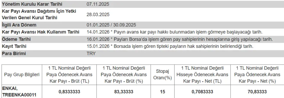 ENKAI temettüsünde stopaj kesintisinin ardından hak sahibi yatırımcılara ödenecek olan net nakit tutar 0,7083 TL olacaktır. Temettü ödemesi için belirlenne tarih ise 14 Ocak 2026. Şu anda hesabınızda ENKAI hissesi olmasa bile 14 Ocak gününden 1 gün öncesine kadar hisseyi borsadan satın alan bütün yatırımcılar bu temettü ödemesini almaya hak kazanacaktır.
