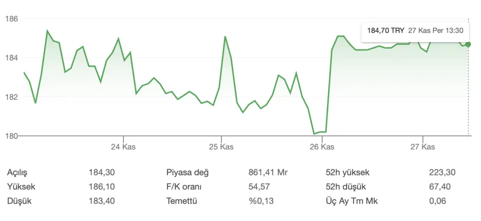 24 Kasım 2025 tarihine 183,87 TL'den başlangıç yapan hisse, salı günü 185,10 TL ile seansa başladı. Temettü ödemesi yaptığı salı gününü 180,20 TL'den noktalayan ASELS, 26 Kasım'da 185,10 TL seviyelerini gördü. ASELS hissesi 27 Kasım 2025 tarihine de 184,30 TL'den başladı. Gün içinde 185,50 TL'leri gören hisse, saat 13.30 itibari ile 184,60 TL'den işlem görüyor.Son 1 ayda %11,59 düşen ASELS, 6 ayda ise %34,16 kazanç sağladı. ASELS hissesi son 1 senede %169,8 değer kazandı.