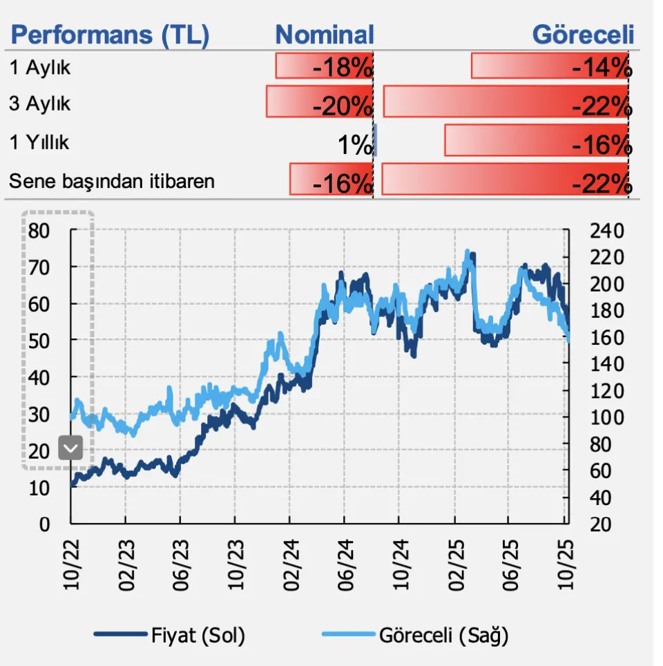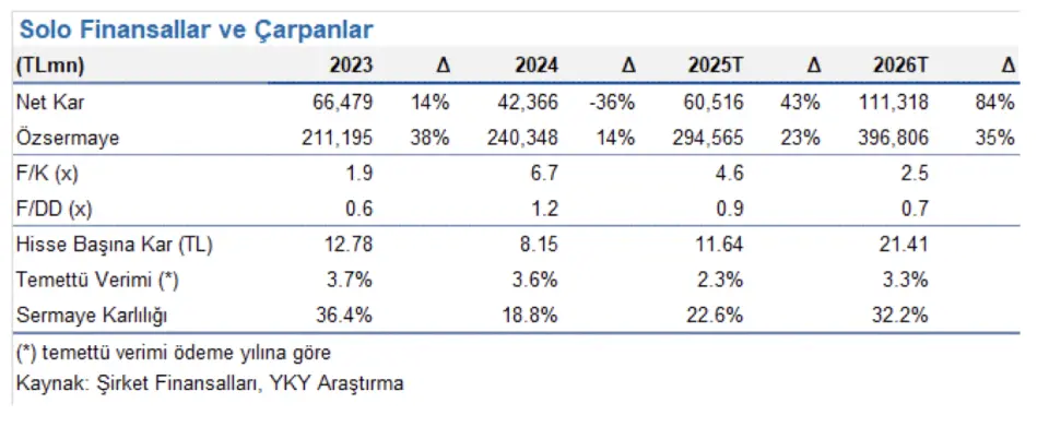 - "Bankanın iyileşmesini beklediğimiz özkaynak karlılığı ve güçlü sermaye oranları sayesinde tavsiyemizi yükselttik. Banka, öngörülerimizle uyumlu olarak, yılbaşından beri XU100/XBANK'ın %22/%9 gerisinde performans sergiledi. Bu durum, yılın ilk 6 ayındaki nispeten zayıf operasyonel sonuçların yansımasıydı. Güncel seviyelerde makroekonomik risklerin önemli derecede fiyatlandığını öngörüyoruz. Akbank, sağlam likiditesi, düşük kaldıraç oranı ve güçlü sermaye yapısı sayesinde faiz indirimlerinden en olumlu etkilenecek bankalardan biri. Akbank 2025/26 tahminlerimize göre 0.9x/0.7x PD/DD ve 4.6x/2.5x F/K ile işlem görmektedir."