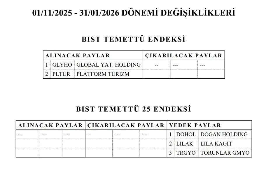 Borsa İstanbul (BIST), 01 Kasım 2025 - 31 Ocak 2026 dönemine ait endeks değişikliklerini duyurdu. Açıklamaya göre, bu dönemde BIST Temettü Endeksi’ne iki yeni hisse eklenecek. Söz konusu hisseler Global Yatırım Holding (GLYHO) ve Platform Turizm (PLTUR) olarak açıklandı. Endeksten çıksrılacak herhangi bir pay bulunmuyor.