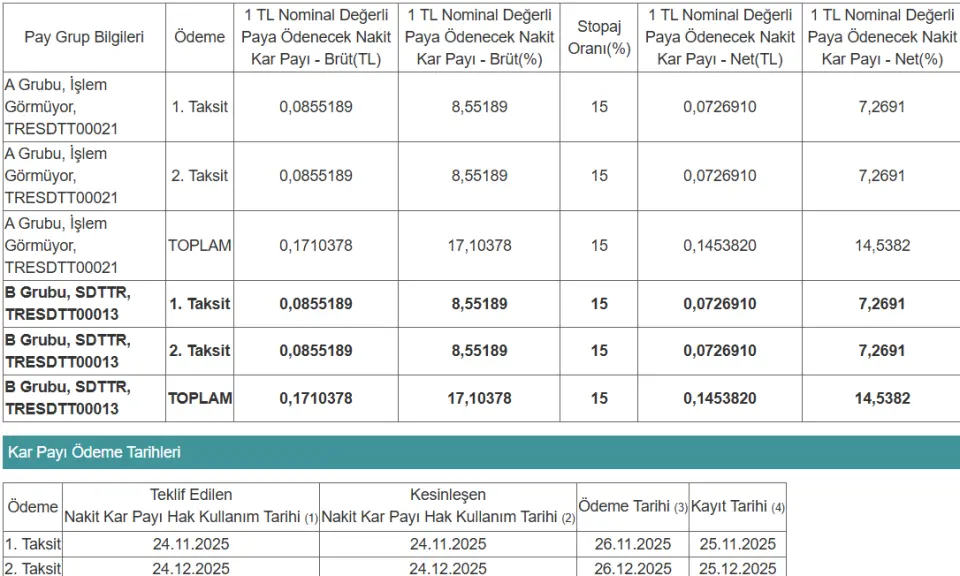 2 taksitte yapılacak olan temettü ödemesinde hak sahibi yatıırmcılar, pay başına toplam 0,1710378 TL alacak. 2 eşit taksitte yapılacak olan temettü ödemesi tarihleri ise 24 Kasım ve 24 Aralık olarak açıklandı.