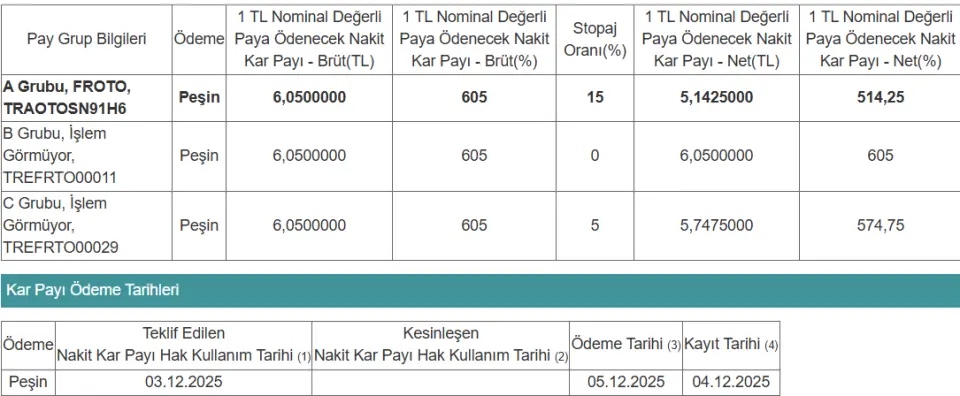 FROTO temettüsünde stopaj kesintisinin ardından hak sahibi yatırımcılara verilecek olan net nakit temettü miktarı ise 5,7475 TL olacak