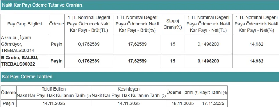 %17,62589 oranında ödenecek nakit temettüde pay başına nakit ödeme tutarı 0,1762589 Lira olacak. Stopaj kesintisinin ardında hak sahibi yatırımcılar pay başına net nakit 0,14982 Lira ödeme alacak.