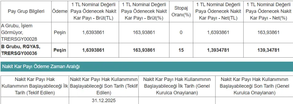 RGYAS temettüsünde stopaj kesintisinin ardından hak sahibi yatırımcılara ödenecek net nakit tutar ise 1,393 TLolacaktır. Henüz hesabında RGYAS hissesi olmayan ancak bu temettü ödemesinden yararlanmak isteyen yatırımcılar 31 Aralık gününden 1 gün öncesine kadar hisseyi borsadan satın aldıkları taktirde temettü ödemesi almaya hak kazanacaklardır.
