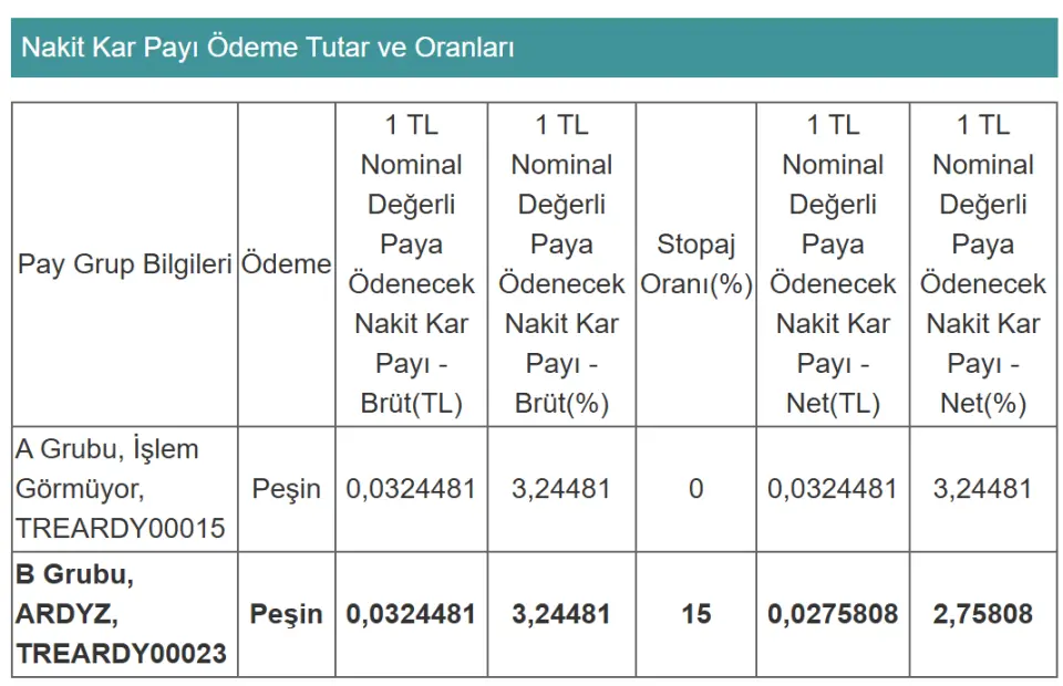 17-21 Kasım tarihleri arasında yatırımcılarına kar payı ödemesi yapacak şirketler belli oldu. Yatırımcılarına temettü ödemesi yapacak iki adet şirket bulunuyor. Bunlar şu şekilde:17 Kasım Pazartesi günü ARD GRUP BİLİŞİM TEKNOLOJİLERİ A.Ş. şirketi temettü ödemesi yapacak. Şirket yatırımcılarına 1 TL nominal değerli paya ödeyeceği nakit kar payı tutarını 0,0324481 TL olarak belirlemiş. Bu tutar brüt %3,24'lük bir temettü olarak ortaya çıkıyor. A grubu paylara ödenecek brüt ve net kar payı miktarı aynı olurken, B grubu paylarında brüt 0,0324481 TL olan temettü, net olarak 0,0275808 TL ödenecek.