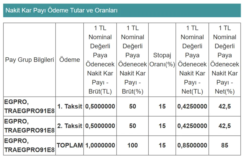 Haftanın ikinci temettüsü ise EGE PROFİL TİCARET VE SANAYİ A.Ş. şirketinden geliyor. Şirket ödemesini 2 taksit olarak belirlemiş. 20 Kasım Perşembe günü ödenecek olan temettü, ikinci taksit oalcak. Şirket yatırımcılarına 1 TL nominal değerli paya ödeyeceği nakit kar payı tutarını toplamda 1 TL olarak belirlemiş. İki taksite bölünen temettü ödemesi brüt 0,5 TL olarak yapılacak. Bu tutar stopaj kesintisinin ardından 0,4250000 TL olarak görünüyor.