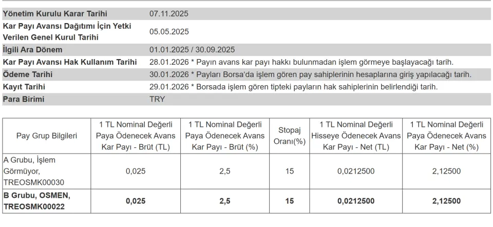 Kar payı avansı hak kullanım tarihi 28 Ocak 2026 Çarşamba günü olarak belirlendi. T+2 takas süresi nedeniyle ödemeler ise yatırımcıların hesaplarına 30 Ocak 2026 tarihinde yatırılacak.