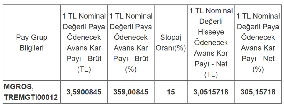 İlk temettü ödemesi 12 Kasım Çarşamba günü Migros Ticaret AŞ tarafından yapılacak. Bu şirket 1 TL nominal değerli paya ödenecek avans kar payını brüt olarak 3.59 TL olarak açıkladı. %15'lik stopaj kesintisinden sonra bu miktar net olarak 3.05 TL olarak görünüyor.
