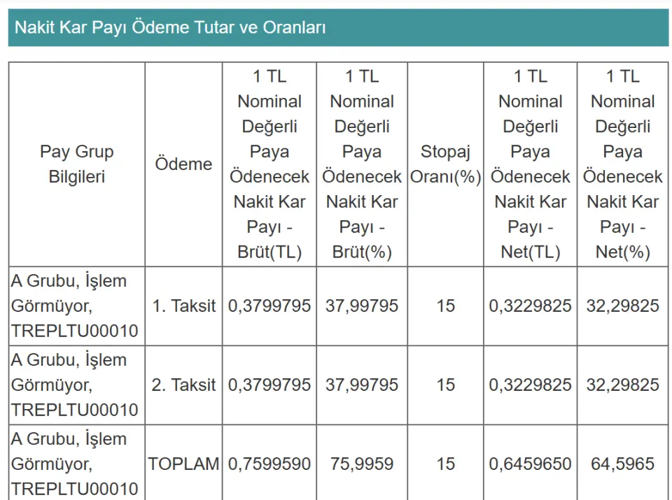 13 Kasım 2025 tarihinde ise bir şirket temettü ödemesi yapacak. Bu şirket Platform Turizm Taşımacılık olarak ortaya çıkıyor. Şirketin ödemesi 2'ye böldüğü kar payının 2. taksiti olarak görünüyor. Bu miktar pay başına brüt 0.38 TL olurken pay başına net 0.32 TL olarak dikkat çekiyor.