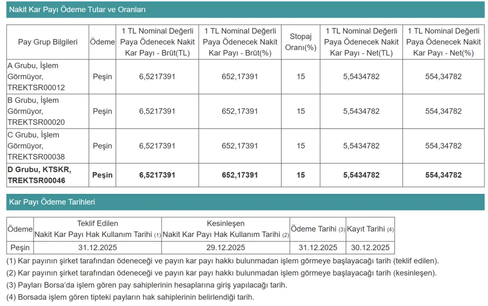 Temettü takvimine göre, yatırımcıların kar payına hak kazanabilmeleri için hisse senedine sahip olmaları gereken tarih (Hak Kullanım Tarihi) 29 Aralık 2025 olarak kesinleşti.